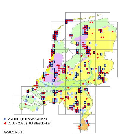 Het aantal atlasblokken (5x5 km) waarin de soort is gemeld binnen een periode van vijf jaar (vanaf 1980) of twintig jaar. Niet gecorrigeerd voor waarnemersinspanning en het aantal doorgegeven waarnemingen kan sterk variƫren per periode, dus een trend in verspreiding kan hier niet direct uit worden afgelezen. Het opgegeven jaartal is het eerste jaar van de periode. Bron: gevalideerde waarnemingen uit de NDFF.