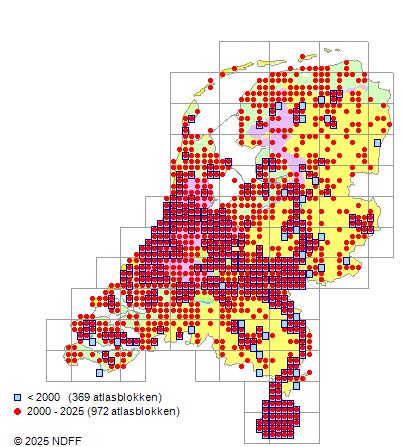 Het aantal atlasblokken (5x5 km) waarin de soort is gemeld binnen een periode van vijf jaar (vanaf 1980) of twintig jaar. Niet gecorrigeerd voor waarnemersinspanning en het aantal doorgegeven waarnemingen kan sterk variƫren per periode, dus een trend in verspreiding kan hier niet direct uit worden afgelezen. Het opgegeven jaartal is het eerste jaar van de periode. Bron: gevalideerde waarnemingen uit de NDFF.