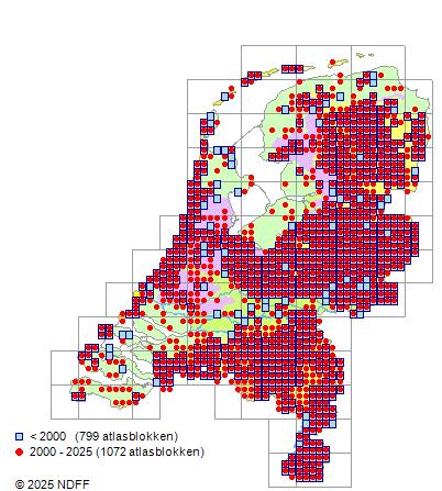 Het aantal atlasblokken (5x5 km) waarin de soort is gemeld binnen een periode van vijf jaar (vanaf 1980) of twintig jaar. Niet gecorrigeerd voor waarnemersinspanning en het aantal doorgegeven waarnemingen kan sterk variëren per periode, dus een trend in verspreiding kan hier niet direct uit worden afgelezen. Het opgegeven jaartal is het eerste jaar van de periode. Bron: gevalideerde waarnemingen uit de NDFF.