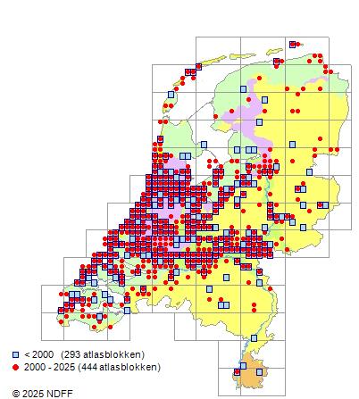 Het aantal atlasblokken (5x5 km) waarin de soort is gemeld binnen een periode van vijf jaar (vanaf 1980) of twintig jaar. Niet gecorrigeerd voor waarnemersinspanning en het aantal doorgegeven waarnemingen kan sterk variëren per periode, dus een trend in verspreiding kan hier niet direct uit worden afgelezen. Het opgegeven jaartal is het eerste jaar van de periode. Bron: gevalideerde waarnemingen uit de NDFF.