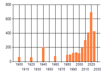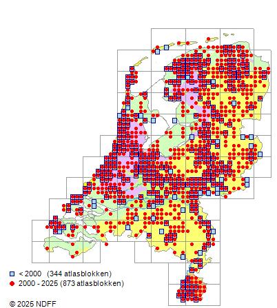 Het aantal atlasblokken (5x5 km) waarin de soort is gemeld binnen een periode van vijf jaar (vanaf 1980) of twintig jaar. Niet gecorrigeerd voor waarnemersinspanning en het aantal doorgegeven waarnemingen kan sterk variëren per periode, dus een trend in verspreiding kan hier niet direct uit worden afgelezen. Het opgegeven jaartal is het eerste jaar van de periode. Bron: gevalideerde waarnemingen uit de NDFF.