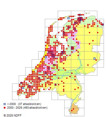Het aantal atlasblokken (5x5 km) waarin de soort is gemeld binnen een periode van vijf jaar (vanaf 1980) of twintig jaar. Niet gecorrigeerd voor waarnemersinspanning en het aantal doorgegeven waarnemingen kan sterk variƫren per periode, dus een trend in verspreiding kan hier niet direct uit worden afgelezen. Het opgegeven jaartal is het eerste jaar van de periode. Bron: gevalideerde waarnemingen uit de NDFF.