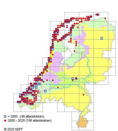 Het aantal atlasblokken (5x5 km) waarin de soort is gemeld binnen een periode van vijf jaar (vanaf 1980) of twintig jaar. Niet gecorrigeerd voor waarnemersinspanning en het aantal doorgegeven waarnemingen kan sterk variƫren per periode, dus een trend in verspreiding kan hier niet direct uit worden afgelezen. Het opgegeven jaartal is het eerste jaar van de periode. Bron: gevalideerde waarnemingen uit de NDFF.
