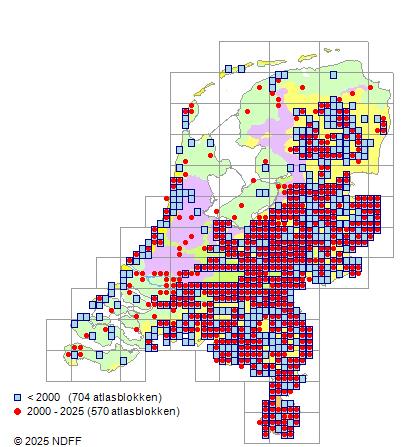 Het aantal atlasblokken (5x5 km) waarin de soort is gemeld binnen een periode van vijf jaar (vanaf 1980) of twintig jaar. Niet gecorrigeerd voor waarnemersinspanning en het aantal doorgegeven waarnemingen kan sterk variëren per periode, dus een trend in verspreiding kan hier niet direct uit worden afgelezen. Het opgegeven jaartal is het eerste jaar van de periode. Bron: gevalideerde waarnemingen uit de NDFF.