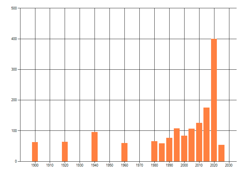 Het aantal atlasblokken (5x5 km) waarin de soort is gemeld binnen een periode van vijf jaar (vanaf 1980) of twintig jaar. Niet gecorrigeerd voor waarnemersinspanning en het aantal doorgegeven waarnemingen kan sterk variëren per periode, dus een trend in verspreiding kan hier niet direct uit worden afgelezen. Het opgegeven jaartal is het eerste jaar van de periode. Bron: gevalideerde waarnemingen uit de NDFF.