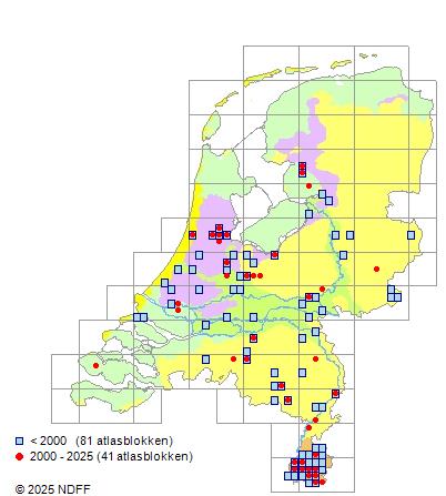 Het aantal atlasblokken (5x5 km) waarin de soort is gemeld binnen een periode van vijf jaar (vanaf 1980) of twintig jaar. Niet gecorrigeerd voor waarnemersinspanning en het aantal doorgegeven waarnemingen kan sterk variëren per periode, dus een trend in verspreiding kan hier niet direct uit worden afgelezen. Het opgegeven jaartal is het eerste jaar van de periode. Bron: gevalideerde waarnemingen uit de NDFF.