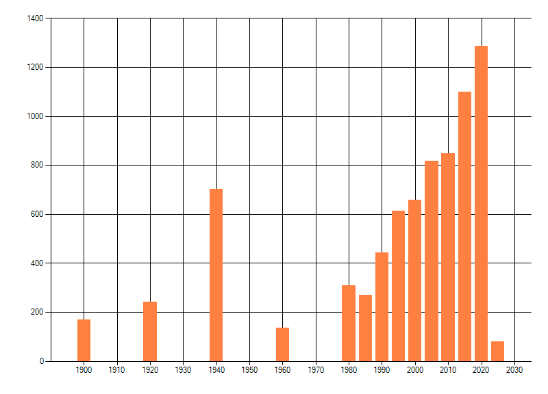 Het aantal atlasblokken (5x5 km) waarin de soort is gemeld binnen een periode van vijf jaar (vanaf 1980) of twintig jaar. Niet gecorrigeerd voor waarnemersinspanning en het aantal doorgegeven waarnemingen kan sterk variƫren per periode, dus een trend in verspreiding kan hier niet direct uit worden afgelezen. Het opgegeven jaartal is het eerste jaar van de periode. Bron: gevalideerde waarnemingen uit de NDFF.