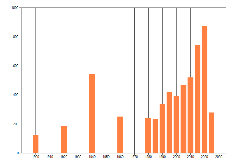 Het aantal atlasblokken (5x5 km) waarin de soort is gemeld binnen een periode van vijf jaar (vanaf 1980) of twintig jaar. Niet gecorrigeerd voor waarnemersinspanning en het aantal doorgegeven waarnemingen kan sterk variëren per periode, dus een trend in verspreiding kan hier niet direct uit worden afgelezen. Het opgegeven jaartal is het eerste jaar van de periode. Bron: gevalideerde waarnemingen uit de NDFF.