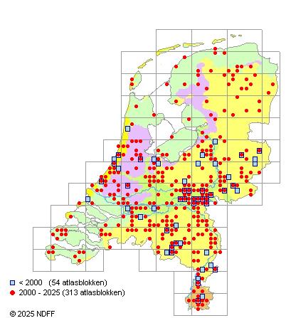 Het aantal atlasblokken (5x5 km) waarin de soort is gemeld binnen een periode van vijf jaar (vanaf 1980) of twintig jaar. Niet gecorrigeerd voor waarnemersinspanning en het aantal doorgegeven waarnemingen kan sterk variëren per periode, dus een trend in verspreiding kan hier niet direct uit worden afgelezen. Het opgegeven jaartal is het eerste jaar van de periode. Bron: gevalideerde waarnemingen uit de NDFF.