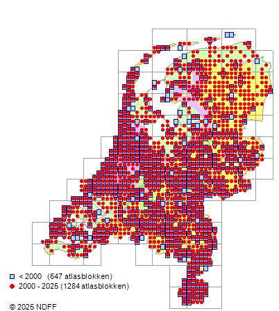 Het aantal atlasblokken (5x5 km) waarin de soort is gemeld binnen een periode van vijf jaar (vanaf 1980) of twintig jaar. Niet gecorrigeerd voor waarnemersinspanning en het aantal doorgegeven waarnemingen kan sterk variëren per periode, dus een trend in verspreiding kan hier niet direct uit worden afgelezen. Het opgegeven jaartal is het eerste jaar van de periode. Bron: gevalideerde waarnemingen uit de NDFF.