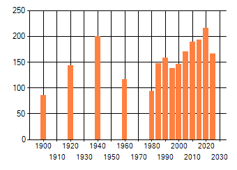 Het aantal atlasblokken (5x5 km) waarin de soort is gemeld binnen een periode van vijf jaar (vanaf 1980) of twintig jaar. Niet gecorrigeerd voor waarnemersinspanning en het aantal doorgegeven waarnemingen kan sterk variëren per periode, dus een trend in verspreiding kan hier niet direct uit worden afgelezen. Het opgegeven jaartal is het eerste jaar van de periode. Bron: gevalideerde waarnemingen uit de NDFF.
