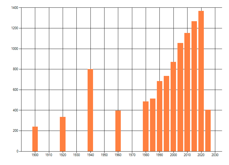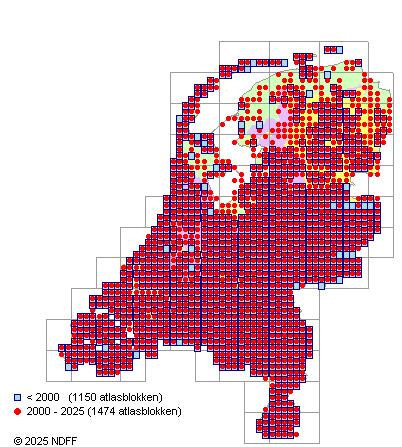 Het aantal atlasblokken (5x5 km) waarin de soort is gemeld binnen een periode van vijf jaar (vanaf 1980) of twintig jaar. Niet gecorrigeerd voor waarnemersinspanning en het aantal doorgegeven waarnemingen kan sterk variëren per periode, dus een trend in verspreiding kan hier niet direct uit worden afgelezen. Het opgegeven jaartal is het eerste jaar van de periode. Bron: gevalideerde waarnemingen uit de NDFF.