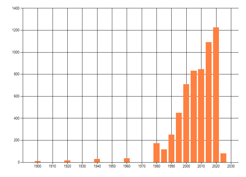 Het aantal atlasblokken (5x5 km) waarin de soort is gemeld binnen een periode van vijf jaar (vanaf 1980) of twintig jaar. Niet gecorrigeerd voor waarnemersinspanning en het aantal doorgegeven waarnemingen kan sterk variƫren per periode, dus een trend in verspreiding kan hier niet direct uit worden afgelezen. Het opgegeven jaartal is het eerste jaar van de periode. Bron: gevalideerde waarnemingen uit de NDFF.