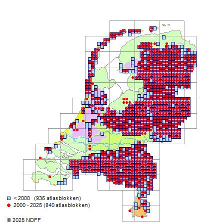 Het aantal atlasblokken (5x5 km) waarin de soort is gemeld binnen een periode van vijf jaar (vanaf 1980) of twintig jaar. Niet gecorrigeerd voor waarnemersinspanning en het aantal doorgegeven waarnemingen kan sterk variëren per periode, dus een trend in verspreiding kan hier niet direct uit worden afgelezen. Het opgegeven jaartal is het eerste jaar van de periode. Bron: gevalideerde waarnemingen uit de NDFF.