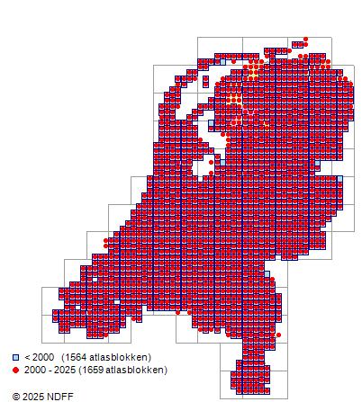 Het aantal atlasblokken (5x5 km) waarin de soort is gemeld binnen een periode van vijf jaar (vanaf 1980) of twintig jaar. Niet gecorrigeerd voor waarnemersinspanning en het aantal doorgegeven waarnemingen kan sterk variëren per periode, dus een trend in verspreiding kan hier niet direct uit worden afgelezen. Het opgegeven jaartal is het eerste jaar van de periode. Bron: gevalideerde waarnemingen uit de NDFF.