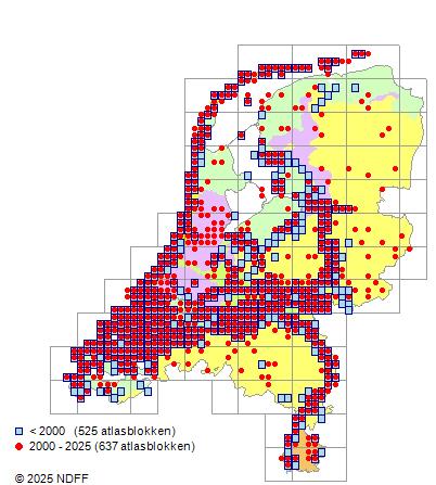 Het aantal atlasblokken (5x5 km) waarin de soort is gemeld binnen een periode van vijf jaar (vanaf 1980) of twintig jaar. Niet gecorrigeerd voor waarnemersinspanning en het aantal doorgegeven waarnemingen kan sterk variƫren per periode, dus een trend in verspreiding kan hier niet direct uit worden afgelezen. Het opgegeven jaartal is het eerste jaar van de periode. Bron: gevalideerde waarnemingen uit de NDFF.