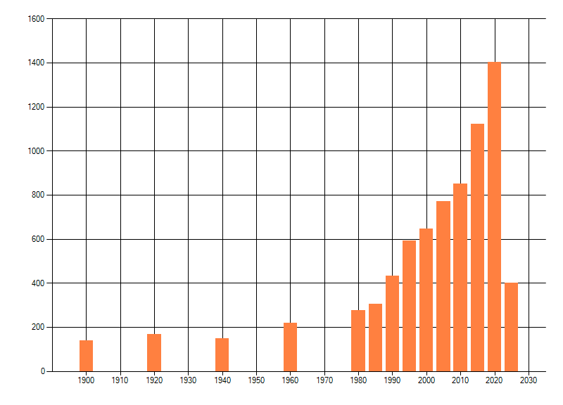 Het aantal atlasblokken (5x5 km) waarin de soort is gemeld binnen een periode van vijf jaar (vanaf 1980) of twintig jaar. Niet gecorrigeerd voor waarnemersinspanning en het aantal doorgegeven waarnemingen kan sterk variëren per periode, dus een trend in verspreiding kan hier niet direct uit worden afgelezen. Het opgegeven jaartal is het eerste jaar van de periode. Bron: gevalideerde waarnemingen uit de NDFF.