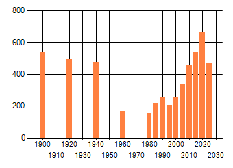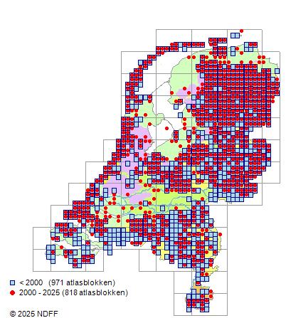 Het aantal atlasblokken (5x5 km) waarin de soort is gemeld binnen een periode van vijf jaar (vanaf 1980) of twintig jaar. Niet gecorrigeerd voor waarnemersinspanning en het aantal doorgegeven waarnemingen kan sterk variëren per periode, dus een trend in verspreiding kan hier niet direct uit worden afgelezen. Het opgegeven jaartal is het eerste jaar van de periode. Bron: gevalideerde waarnemingen uit de NDFF.