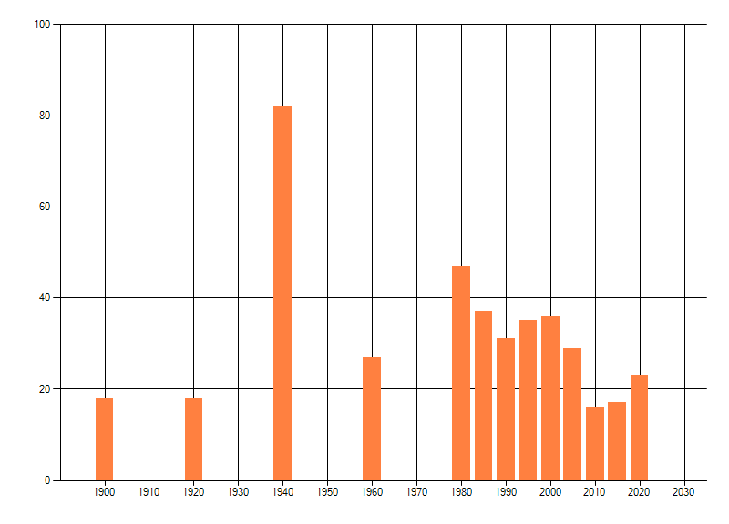 Het aantal atlasblokken (5x5 km) waarin de soort is gemeld binnen een periode van vijf jaar (vanaf 1980) of twintig jaar. Niet gecorrigeerd voor waarnemersinspanning en het aantal doorgegeven waarnemingen kan sterk variëren per periode, dus een trend in verspreiding kan hier niet direct uit worden afgelezen. Het opgegeven jaartal is het eerste jaar van de periode. Bron: gevalideerde waarnemingen uit de NDFF.