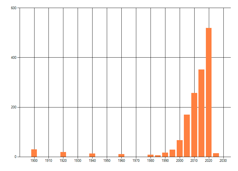 Het aantal atlasblokken (5x5 km) waarin de soort is gemeld binnen een periode van vijf jaar (vanaf 1980) of twintig jaar. Niet gecorrigeerd voor waarnemersinspanning en het aantal doorgegeven waarnemingen kan sterk variƫren per periode, dus een trend in verspreiding kan hier niet direct uit worden afgelezen. Het opgegeven jaartal is het eerste jaar van de periode. Bron: gevalideerde waarnemingen uit de NDFF.