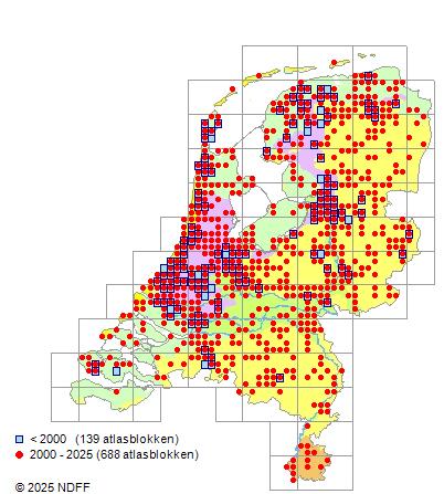 Het aantal atlasblokken (5x5 km) waarin de soort is gemeld binnen een periode van vijf jaar (vanaf 1980) of twintig jaar. Niet gecorrigeerd voor waarnemersinspanning en het aantal doorgegeven waarnemingen kan sterk variëren per periode, dus een trend in verspreiding kan hier niet direct uit worden afgelezen. Het opgegeven jaartal is het eerste jaar van de periode. Bron: gevalideerde waarnemingen uit de NDFF.