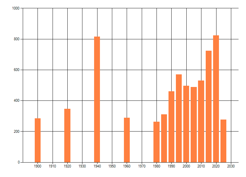 Het aantal atlasblokken (5x5 km) waarin de soort is gemeld binnen een periode van vijf jaar (vanaf 1980) of twintig jaar. Niet gecorrigeerd voor waarnemersinspanning en het aantal doorgegeven waarnemingen kan sterk variƫren per periode, dus een trend in verspreiding kan hier niet direct uit worden afgelezen. Het opgegeven jaartal is het eerste jaar van de periode. Bron: gevalideerde waarnemingen uit de NDFF.