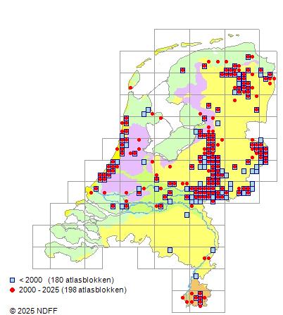 Het aantal atlasblokken (5x5 km) waarin de soort is gemeld binnen een periode van vijf jaar (vanaf 1980) of twintig jaar. Niet gecorrigeerd voor waarnemersinspanning en het aantal doorgegeven waarnemingen kan sterk variëren per periode, dus een trend in verspreiding kan hier niet direct uit worden afgelezen. Het opgegeven jaartal is het eerste jaar van de periode. Bron: gevalideerde waarnemingen uit de NDFF.