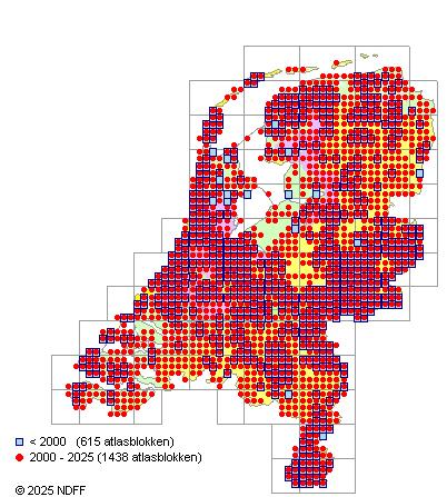 Het aantal atlasblokken (5x5 km) waarin de soort is gemeld binnen een periode van vijf jaar (vanaf 1980) of twintig jaar. Niet gecorrigeerd voor waarnemersinspanning en het aantal doorgegeven waarnemingen kan sterk variëren per periode, dus een trend in verspreiding kan hier niet direct uit worden afgelezen. Het opgegeven jaartal is het eerste jaar van de periode. Bron: gevalideerde waarnemingen uit de NDFF.
