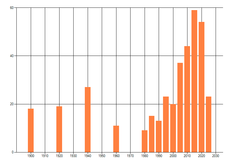 Het aantal atlasblokken (5x5 km) waarin de soort is gemeld binnen een periode van vijf jaar (vanaf 1980) of twintig jaar. Niet gecorrigeerd voor waarnemersinspanning en het aantal doorgegeven waarnemingen kan sterk variƫren per periode, dus een trend in verspreiding kan hier niet direct uit worden afgelezen. Het opgegeven jaartal is het eerste jaar van de periode. Bron: gevalideerde waarnemingen uit de NDFF.