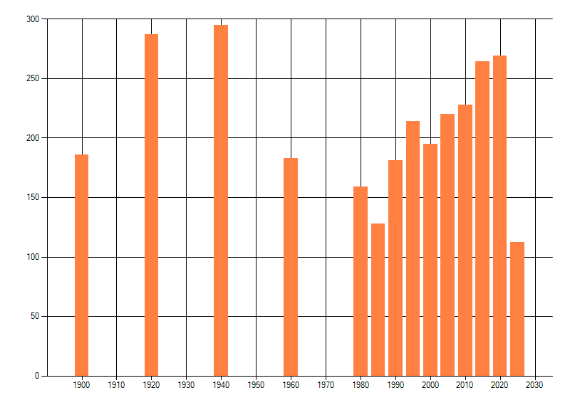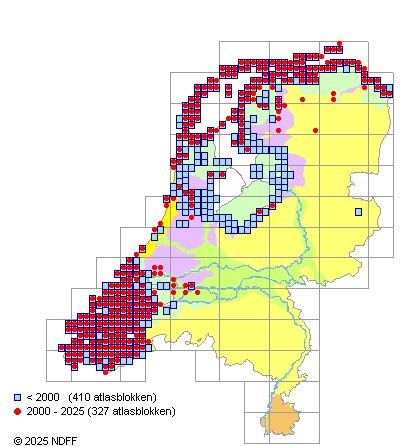 Het aantal atlasblokken (5x5 km) waarin de soort is gemeld binnen een periode van vijf jaar (vanaf 1980) of twintig jaar. Niet gecorrigeerd voor waarnemersinspanning en het aantal doorgegeven waarnemingen kan sterk variëren per periode, dus een trend in verspreiding kan hier niet direct uit worden afgelezen. Het opgegeven jaartal is het eerste jaar van de periode. Bron: gevalideerde waarnemingen uit de NDFF.