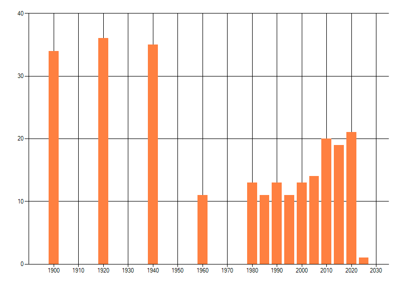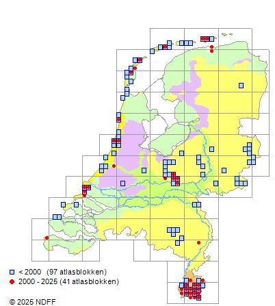 Het aantal atlasblokken (5x5 km) waarin de soort is gemeld binnen een periode van vijf jaar (vanaf 1980) of twintig jaar. Niet gecorrigeerd voor waarnemersinspanning en het aantal doorgegeven waarnemingen kan sterk variëren per periode, dus een trend in verspreiding kan hier niet direct uit worden afgelezen. Het opgegeven jaartal is het eerste jaar van de periode. Bron: gevalideerde waarnemingen uit de NDFF.