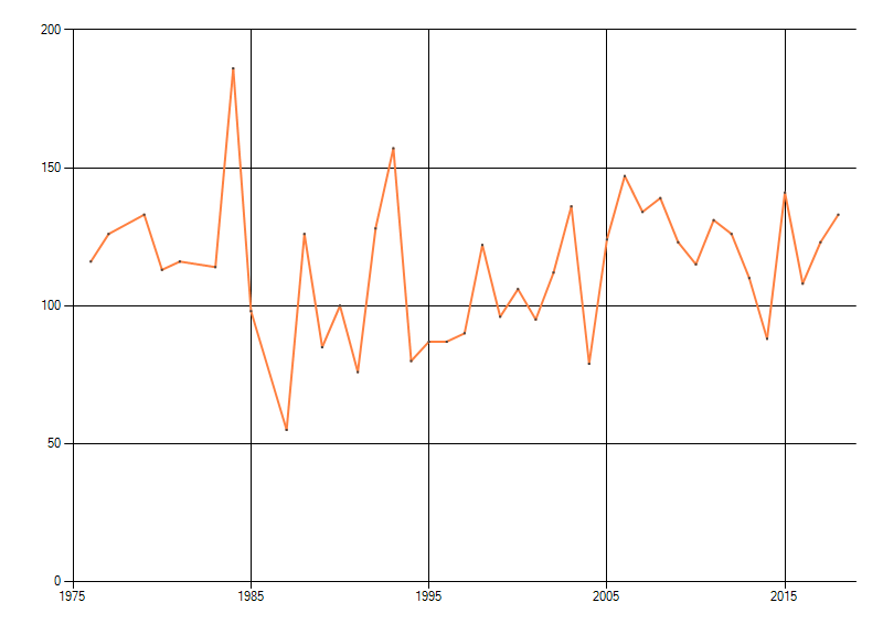 Gemiddelde trend van het aantal kilometerhokken waarin de soort voorkomt, weergegeven als indexcijfer (1975-1978 = 100). De trend is gecorrigeerd voor waarnemersinspanning en geeft de relatieve verandering in het aantal bezette kilometerhokken weer. Voor de berekening worden de data per periode van vier jaar samengenomen. In de grafiek correspondeert ieder punt met het laatste jaar van zo'n periode.