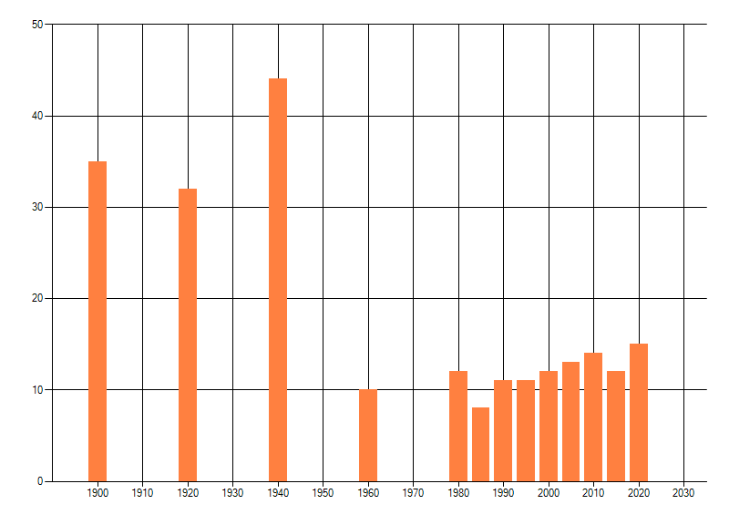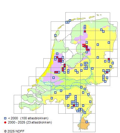 Het aantal atlasblokken (5x5 km) waarin de soort is gemeld binnen een periode van vijf jaar (vanaf 1980) of twintig jaar. Niet gecorrigeerd voor waarnemersinspanning en het aantal doorgegeven waarnemingen kan sterk variëren per periode, dus een trend in verspreiding kan hier niet direct uit worden afgelezen. Het opgegeven jaartal is het eerste jaar van de periode. Bron: gevalideerde waarnemingen uit de NDFF.