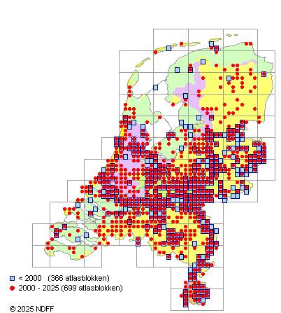 Het aantal atlasblokken (5x5 km) waarin de soort is gemeld binnen een periode van vijf jaar (vanaf 1980) of twintig jaar. Niet gecorrigeerd voor waarnemersinspanning en het aantal doorgegeven waarnemingen kan sterk variëren per periode, dus een trend in verspreiding kan hier niet direct uit worden afgelezen. Het opgegeven jaartal is het eerste jaar van de periode. Bron: gevalideerde waarnemingen uit de NDFF.