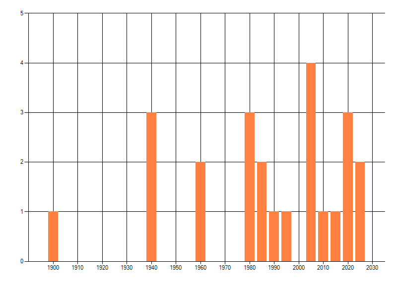 Het aantal atlasblokken (5x5 km) waarin de soort is gemeld binnen een periode van vijf jaar (vanaf 1980) of twintig jaar. Niet gecorrigeerd voor waarnemersinspanning en het aantal doorgegeven waarnemingen kan sterk variëren per periode, dus een trend in verspreiding kan hier niet direct uit worden afgelezen. Het opgegeven jaartal is het eerste jaar van de periode. Bron: gevalideerde waarnemingen uit de NDFF.