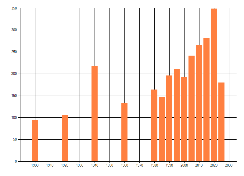 Het aantal atlasblokken (5x5 km) waarin de soort is gemeld binnen een periode van vijf jaar (vanaf 1980) of twintig jaar. Niet gecorrigeerd voor waarnemersinspanning en het aantal doorgegeven waarnemingen kan sterk variëren per periode, dus een trend in verspreiding kan hier niet direct uit worden afgelezen. Het opgegeven jaartal is het eerste jaar van de periode. Bron: gevalideerde waarnemingen uit de NDFF.