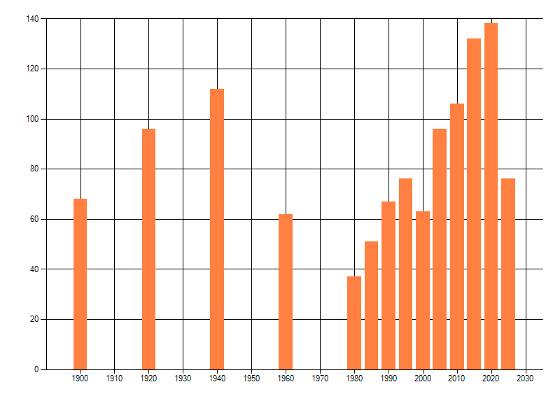Het aantal atlasblokken (5x5 km) waarin de soort is gemeld binnen een periode van vijf jaar (vanaf 1980) of twintig jaar. Niet gecorrigeerd voor waarnemersinspanning en het aantal doorgegeven waarnemingen kan sterk variëren per periode, dus een trend in verspreiding kan hier niet direct uit worden afgelezen. Het opgegeven jaartal is het eerste jaar van de periode. Bron: gevalideerde waarnemingen uit de NDFF.