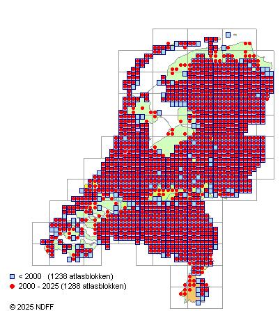 Het aantal atlasblokken (5x5 km) waarin de soort is gemeld binnen een periode van vijf jaar (vanaf 1980) of twintig jaar. Niet gecorrigeerd voor waarnemersinspanning en het aantal doorgegeven waarnemingen kan sterk variëren per periode, dus een trend in verspreiding kan hier niet direct uit worden afgelezen. Het opgegeven jaartal is het eerste jaar van de periode. Bron: gevalideerde waarnemingen uit de NDFF.
