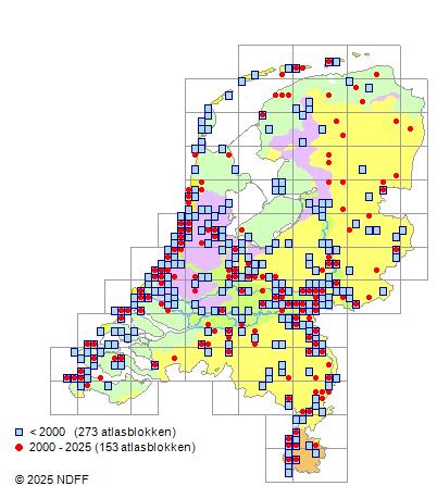 Het aantal atlasblokken (5x5 km) waarin de soort is gemeld binnen een periode van vijf jaar (vanaf 1980) of twintig jaar. Niet gecorrigeerd voor waarnemersinspanning en het aantal doorgegeven waarnemingen kan sterk variëren per periode, dus een trend in verspreiding kan hier niet direct uit worden afgelezen. Het opgegeven jaartal is het eerste jaar van de periode. Bron: gevalideerde waarnemingen uit de NDFF.