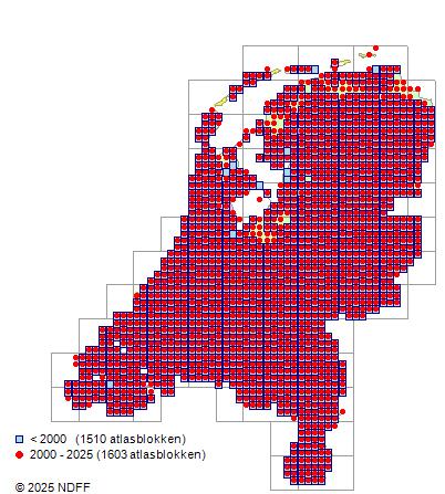 Het aantal atlasblokken (5x5 km) waarin de soort is gemeld binnen een periode van vijf jaar (vanaf 1980) of twintig jaar. Niet gecorrigeerd voor waarnemersinspanning en het aantal doorgegeven waarnemingen kan sterk variëren per periode, dus een trend in verspreiding kan hier niet direct uit worden afgelezen. Het opgegeven jaartal is het eerste jaar van de periode. Bron: gevalideerde waarnemingen uit de NDFF.