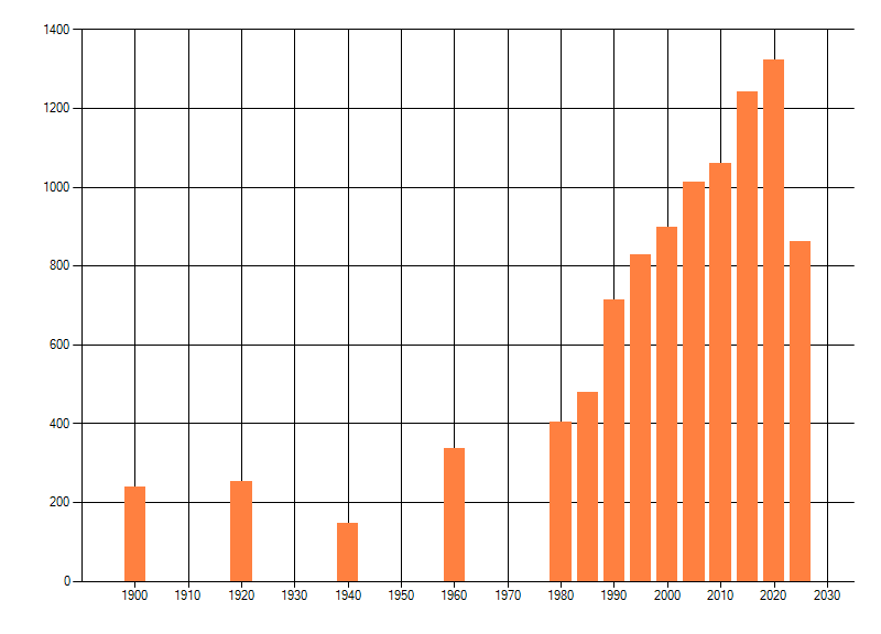 Het aantal atlasblokken (5x5 km) waarin de soort is gemeld binnen een periode van vijf jaar (vanaf 1980) of twintig jaar. Niet gecorrigeerd voor waarnemersinspanning en het aantal doorgegeven waarnemingen kan sterk variƫren per periode, dus een trend in verspreiding kan hier niet direct uit worden afgelezen. Het opgegeven jaartal is het eerste jaar van de periode. Bron: gevalideerde waarnemingen uit de NDFF.