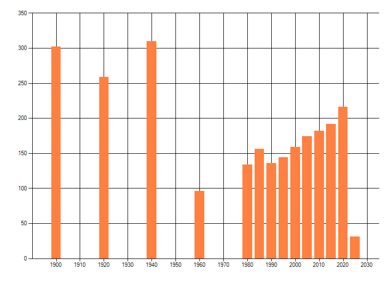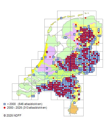 Het aantal atlasblokken (5x5 km) waarin de soort is gemeld binnen een periode van vijf jaar (vanaf 1980) of twintig jaar. Niet gecorrigeerd voor waarnemersinspanning en het aantal doorgegeven waarnemingen kan sterk variëren per periode, dus een trend in verspreiding kan hier niet direct uit worden afgelezen. Het opgegeven jaartal is het eerste jaar van de periode. Bron: gevalideerde waarnemingen uit de NDFF.