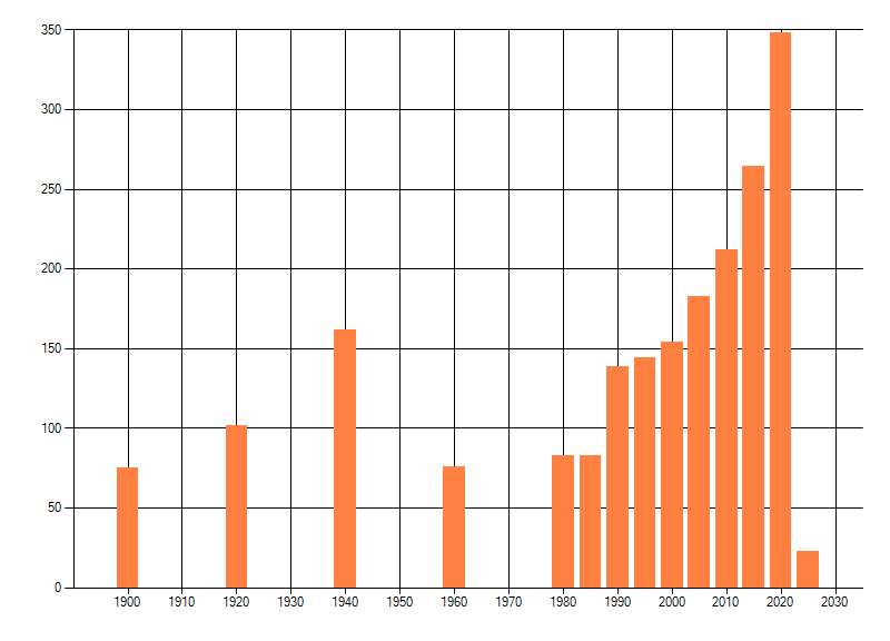 Het aantal atlasblokken (5x5 km) waarin de soort is gemeld binnen een periode van vijf jaar (vanaf 1980) of twintig jaar. Niet gecorrigeerd voor waarnemersinspanning en het aantal doorgegeven waarnemingen kan sterk variƫren per periode, dus een trend in verspreiding kan hier niet direct uit worden afgelezen. Het opgegeven jaartal is het eerste jaar van de periode. Bron: gevalideerde waarnemingen uit de NDFF.