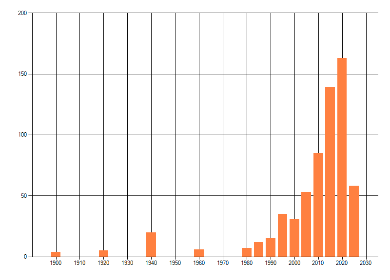 Het aantal atlasblokken (5x5 km) waarin de soort is gemeld binnen een periode van vijf jaar (vanaf 1980) of twintig jaar. Niet gecorrigeerd voor waarnemersinspanning en het aantal doorgegeven waarnemingen kan sterk variƫren per periode, dus een trend in verspreiding kan hier niet direct uit worden afgelezen. Het opgegeven jaartal is het eerste jaar van de periode. Bron: gevalideerde waarnemingen uit de NDFF.
