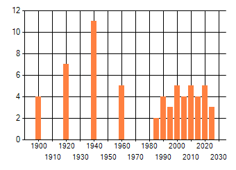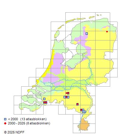Het aantal atlasblokken (5x5 km) waarin de soort is gemeld binnen een periode van vijf jaar (vanaf 1980) of twintig jaar. Niet gecorrigeerd voor waarnemersinspanning en het aantal doorgegeven waarnemingen kan sterk variëren per periode, dus een trend in verspreiding kan hier niet direct uit worden afgelezen. Het opgegeven jaartal is het eerste jaar van de periode. Bron: gevalideerde waarnemingen uit de NDFF.