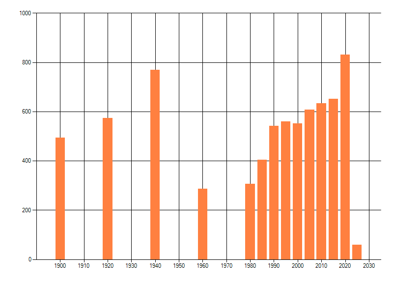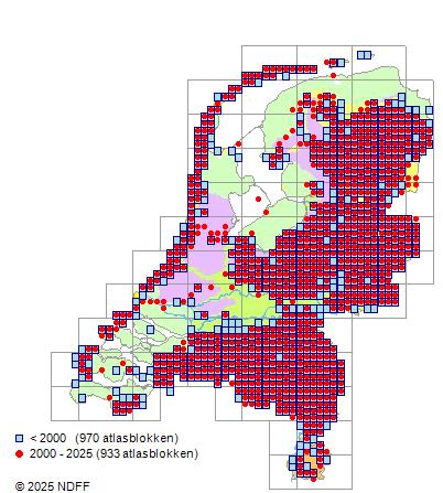 Het aantal atlasblokken (5x5 km) waarin de soort is gemeld binnen een periode van vijf jaar (vanaf 1980) of twintig jaar. Niet gecorrigeerd voor waarnemersinspanning en het aantal doorgegeven waarnemingen kan sterk variƫren per periode, dus een trend in verspreiding kan hier niet direct uit worden afgelezen. Het opgegeven jaartal is het eerste jaar van de periode. Bron: gevalideerde waarnemingen uit de NDFF.