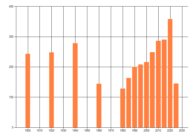 Het aantal atlasblokken (5x5 km) waarin de soort is gemeld binnen een periode van vijf jaar (vanaf 1980) of twintig jaar. Niet gecorrigeerd voor waarnemersinspanning en het aantal doorgegeven waarnemingen kan sterk variƫren per periode, dus een trend in verspreiding kan hier niet direct uit worden afgelezen. Het opgegeven jaartal is het eerste jaar van de periode. Bron: gevalideerde waarnemingen uit de NDFF.