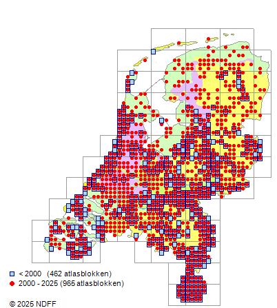 Het aantal atlasblokken (5x5 km) waarin de soort is gemeld binnen een periode van vijf jaar (vanaf 1980) of twintig jaar. Niet gecorrigeerd voor waarnemersinspanning en het aantal doorgegeven waarnemingen kan sterk variëren per periode, dus een trend in verspreiding kan hier niet direct uit worden afgelezen. Het opgegeven jaartal is het eerste jaar van de periode. Bron: gevalideerde waarnemingen uit de NDFF.
