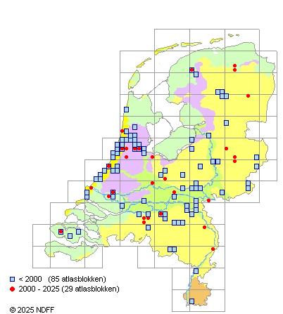 Het aantal atlasblokken (5x5 km) waarin de soort is gemeld binnen een periode van vijf jaar (vanaf 1980) of twintig jaar. Niet gecorrigeerd voor waarnemersinspanning en het aantal doorgegeven waarnemingen kan sterk variëren per periode, dus een trend in verspreiding kan hier niet direct uit worden afgelezen. Het opgegeven jaartal is het eerste jaar van de periode. Bron: gevalideerde waarnemingen uit de NDFF.