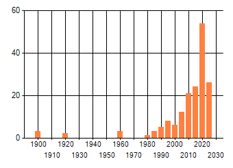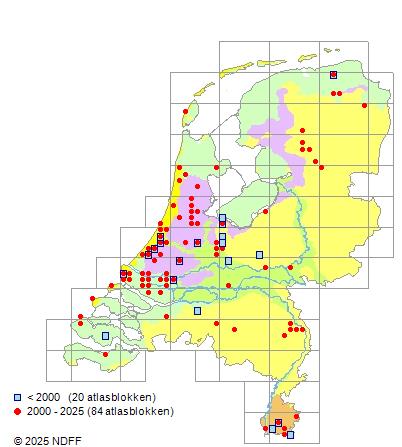 Het aantal atlasblokken (5x5 km) waarin de soort is gemeld binnen een periode van vijf jaar (vanaf 1980) of twintig jaar. Niet gecorrigeerd voor waarnemersinspanning en het aantal doorgegeven waarnemingen kan sterk variëren per periode, dus een trend in verspreiding kan hier niet direct uit worden afgelezen. Het opgegeven jaartal is het eerste jaar van de periode. Bron: gevalideerde waarnemingen uit de NDFF.